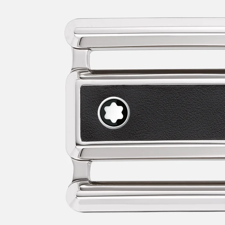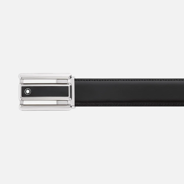 Rectangular Cut-Out 3 Rings Motif Black Leather & Stainless Steel finish Buckle. Self-adjustable, 3 cm x 120 cm, reversible black and brown leather strap.