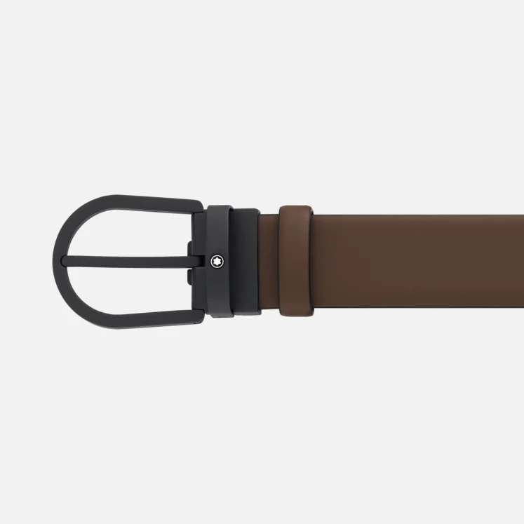 Horseshoe black rubberized finish pin buckle. Self-adjustable, 3.5 cm x 120 cm, strap in brown plain leather.