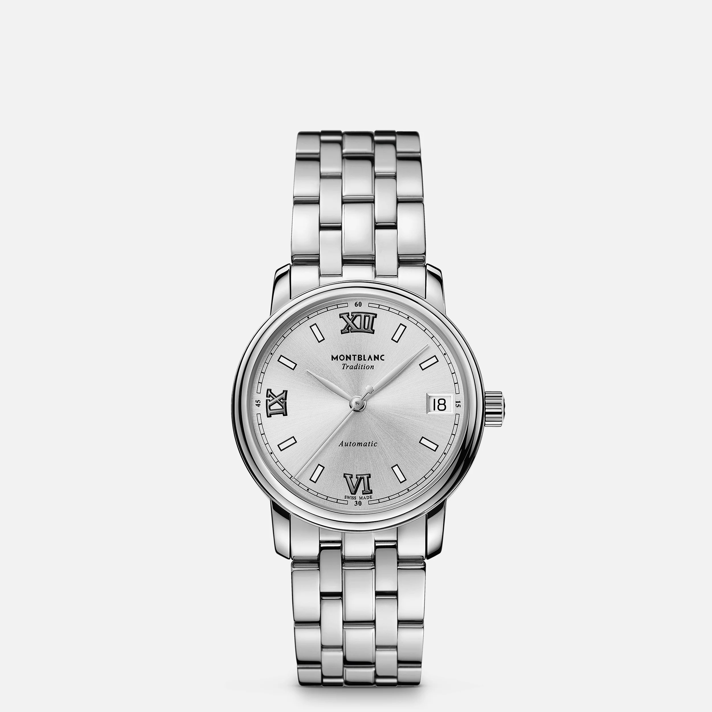 The Montblanc Tradition Collection boasts both a characteristic Montblanc design expression as well as classic watchmaking codes. The Montblanc Tradition Automatic Date comes in a 32 mm stainless steel case with straight horns and a double-shaped bezel. The timepiece features a silver-white coloured dial with rhodium-coated Roman numerals in relief and white indexes. The traditional railway minuterie and the classic leaf-shaped and baton-shaped hands complete this elegant appearance.